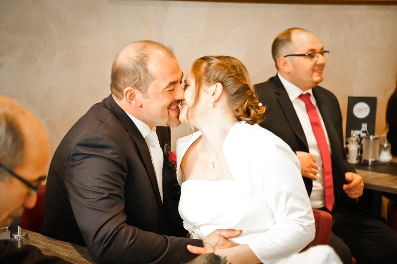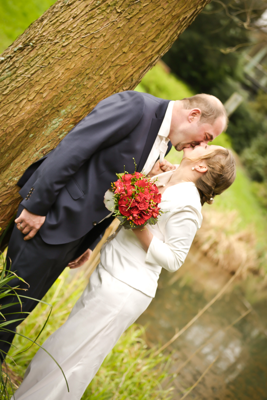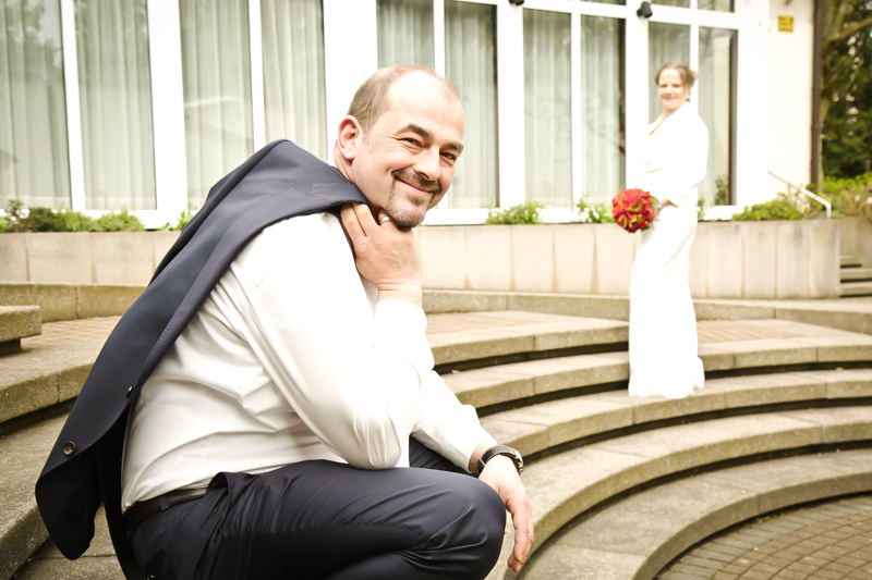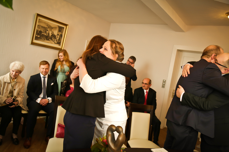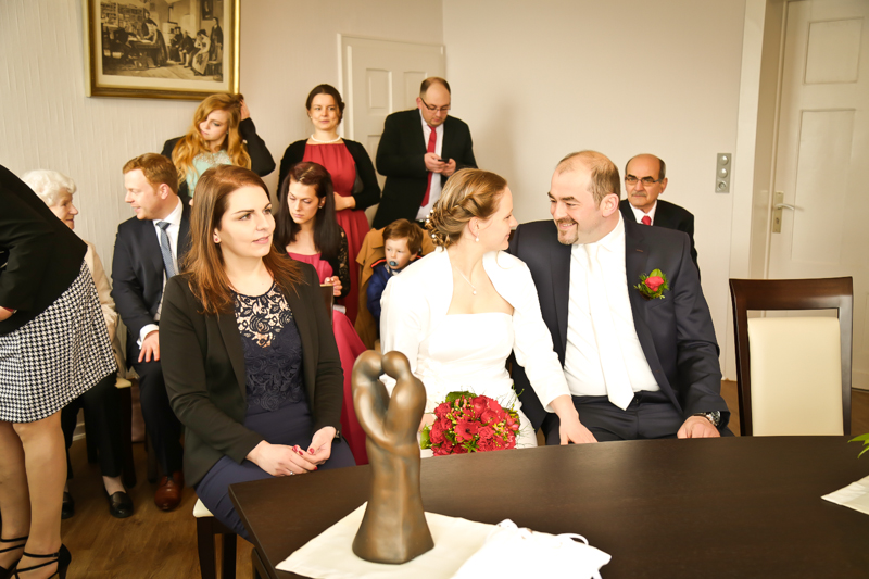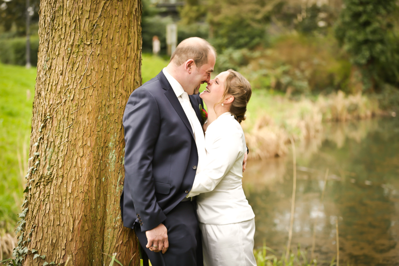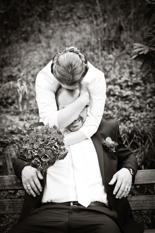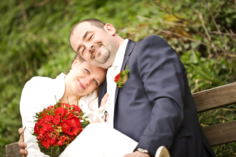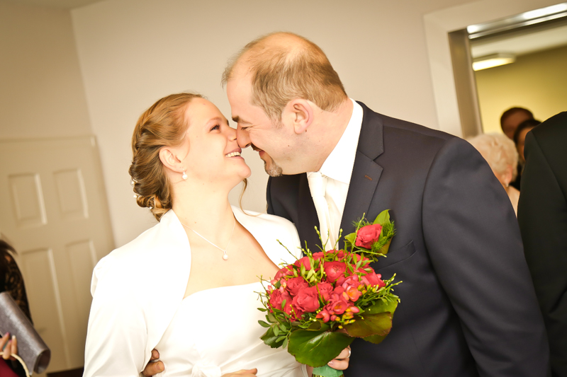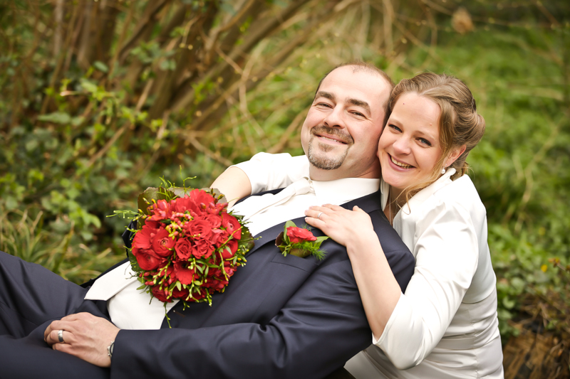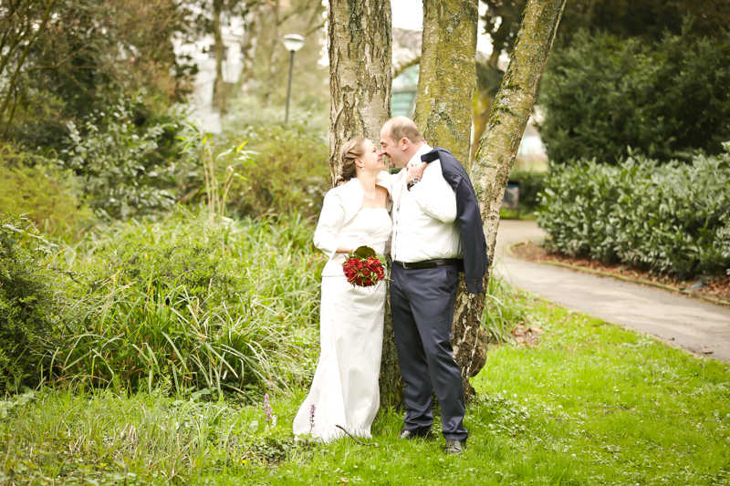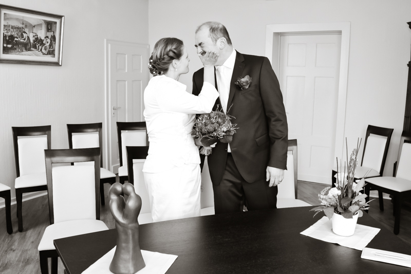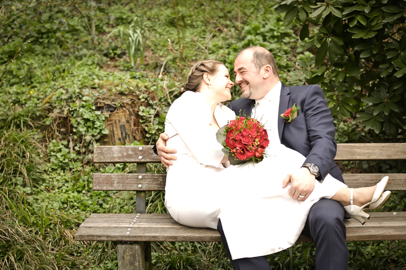 Während der Trauung waren beide sehr bewegt und so rollten die ersten Tränken über die Wangen. Ein deutliches Ja auf beiden Seiten sorgte für einen innigen Moment. Nach geleisteter Unterschrift, war das Glück besiegelt. Nach den Gratulationen durch die Familien folgten die Bilder fürs Familienalbum. Danach ging es weiter zum Sektempfang in ein nahegelegnes Café. Während die Gäste dort kurz verschnaufen konnten, ging es für uns zum Brautpaarshooting in einen nahegelegnen Park. Hier flapsten die beiden mächtig rum und es gab viele Momente, wo wir vor lauter Lachen kaum noch Fotos machen konnten. So entstanden eine ganze Menge sehr natürlicher und ausgelassener Brautpaarbilder. Schon nach kurzer Zeit beendeten wir die Session und fuhren zur Location, in der die Feier geplant war. Auch hier nutzten wir noch einmal die Gelegenheit ein paar intime Fotos der beiden zu schießen.