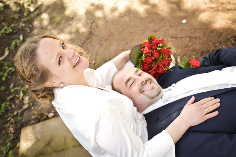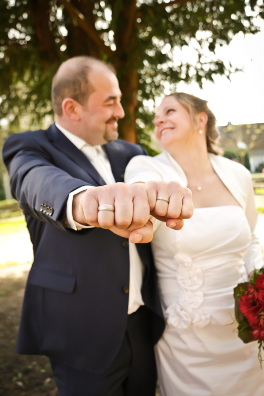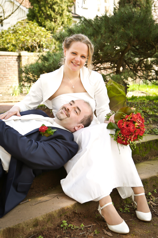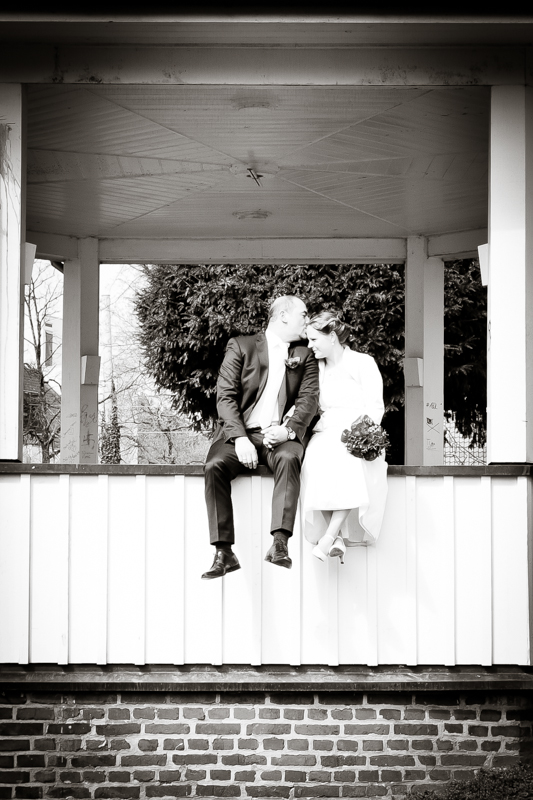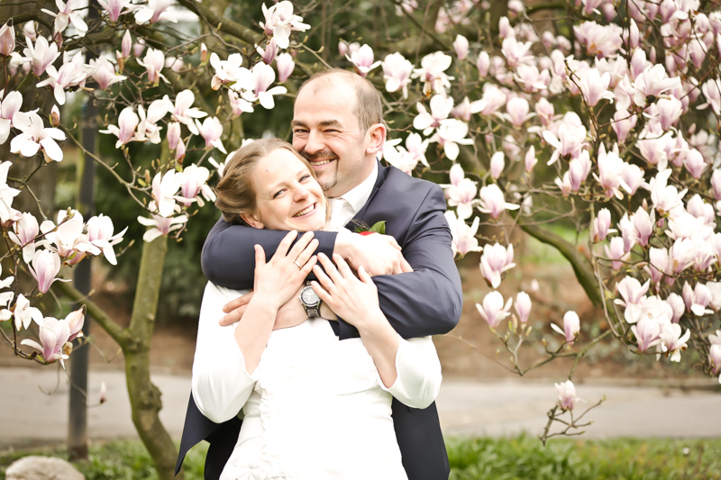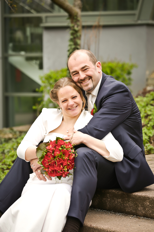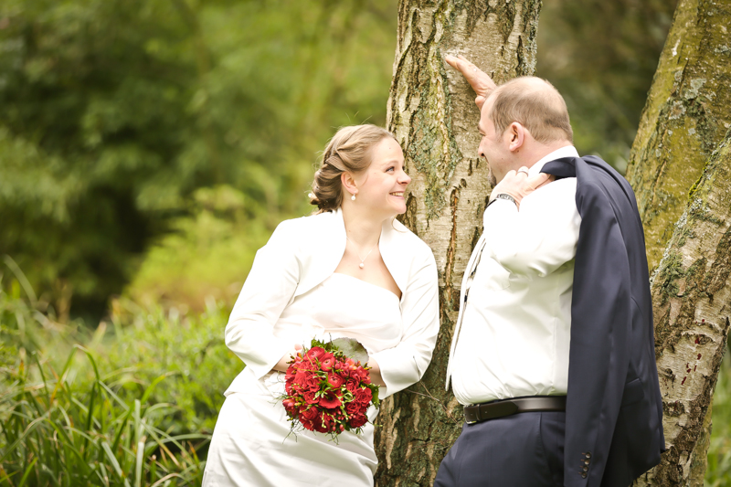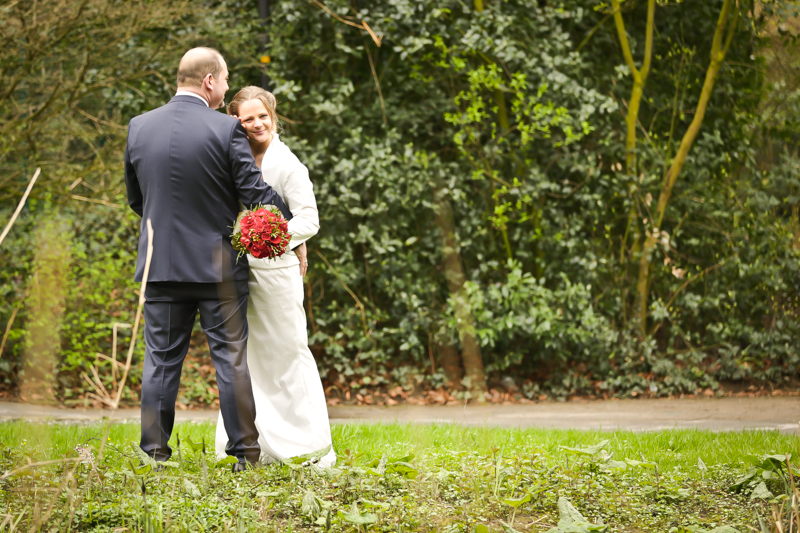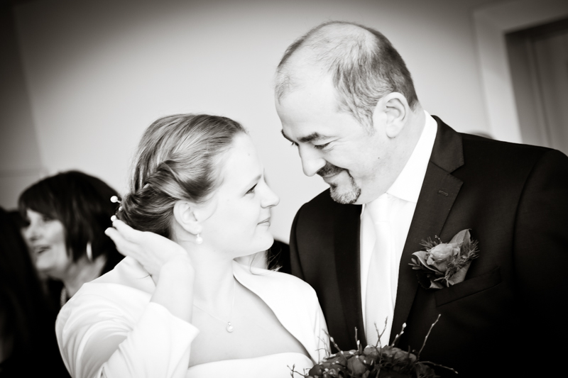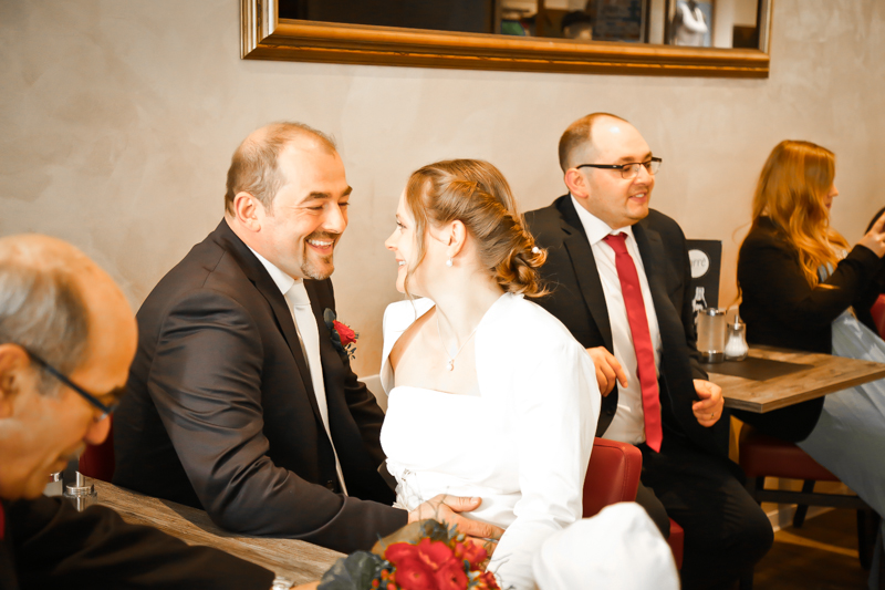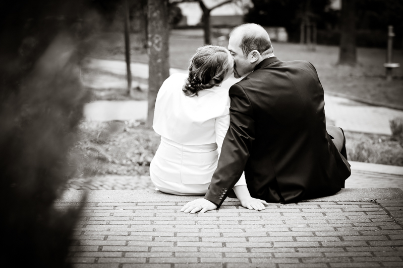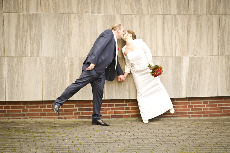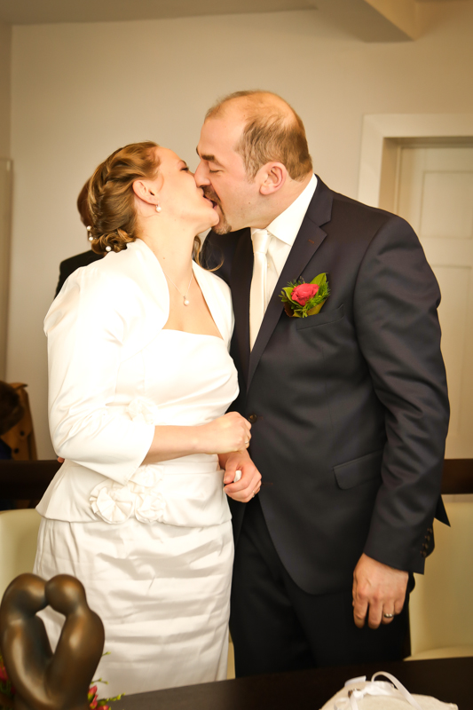 Während der Trauung waren beide sehr bewegt und so rollten die ersten Tränken über die Wangen. Ein deutliches Ja auf beiden Seiten sorgte für einen innigen Moment. Nach geleisteter Unterschrift, war das Glück besiegelt. Nach den Gratulationen durch die Familien folgten die Bilder fürs Familienalbum. Danach ging es weiter zum Sektempfang in ein nahegelegnes Café. Während die Gäste dort kurz verschnaufen konnten, ging es für uns zum Brautpaarshooting in einen nahegelegnen Park. Hier flapsten die beiden mächtig rum und es gab viele Momente, wo wir vor lauter Lachen kaum noch Fotos machen konnten. So entstanden eine ganze Menge sehr natürlicher und ausgelassener Brautpaarbilder. Schon nach kurzer Zeit beendeten wir die Session und fuhren zur Location, in der die Feier geplant war. Auch hier nutzten wir noch einmal die Gelegenheit ein paar intime Fotos der beiden zu schießen.