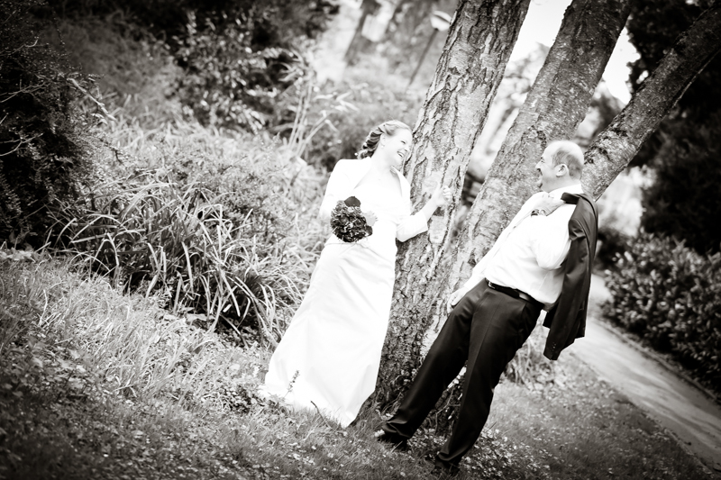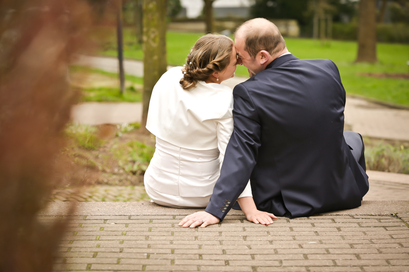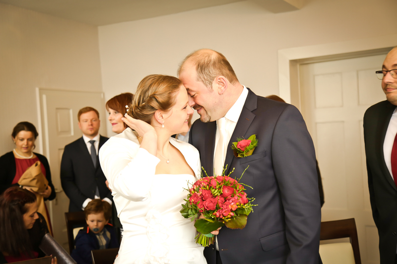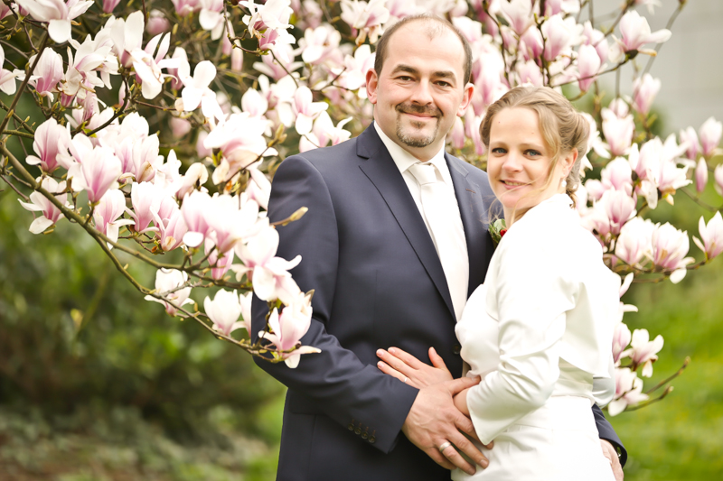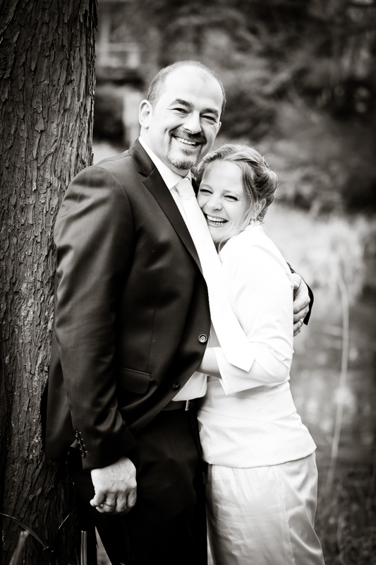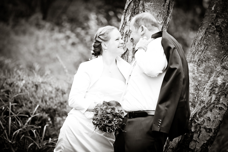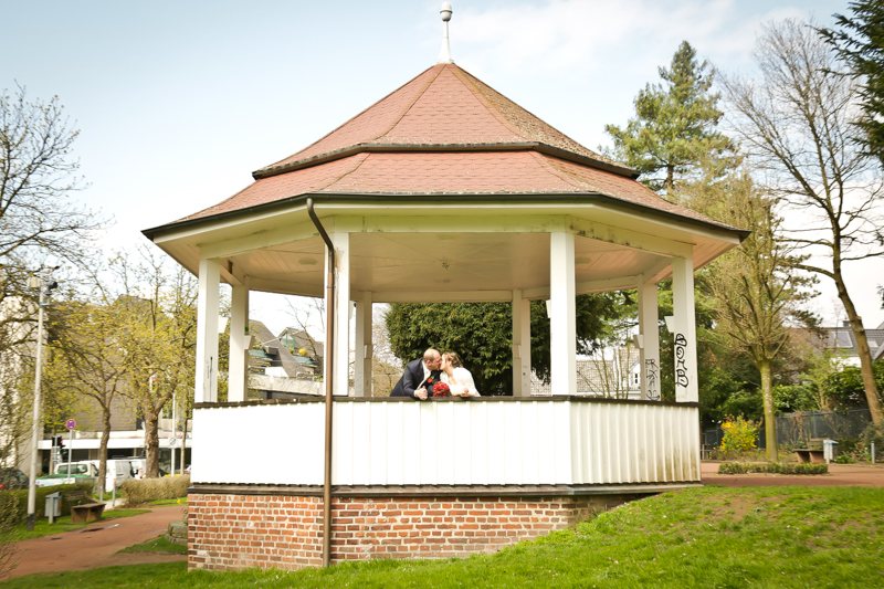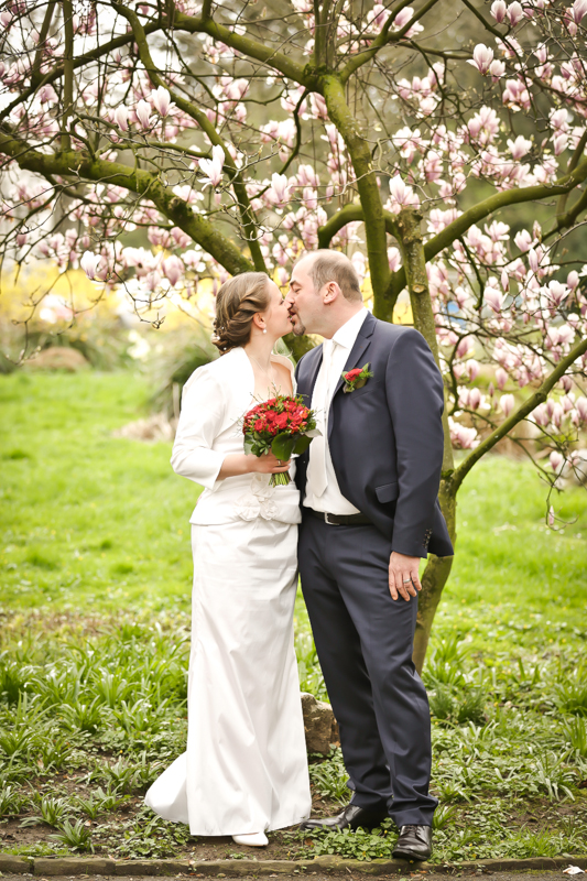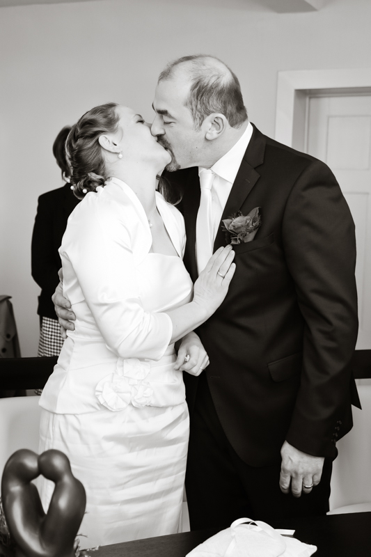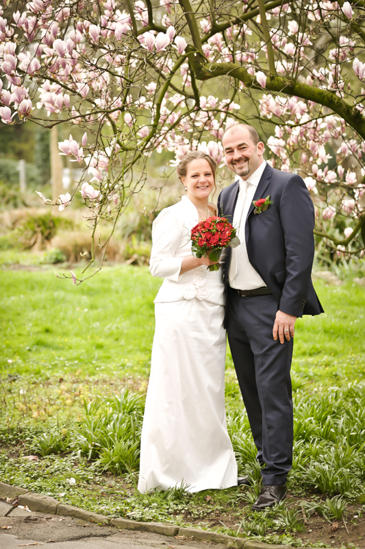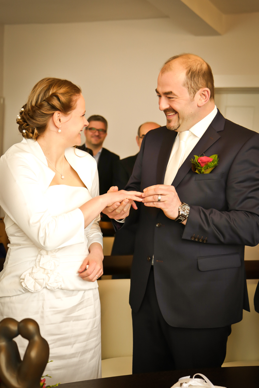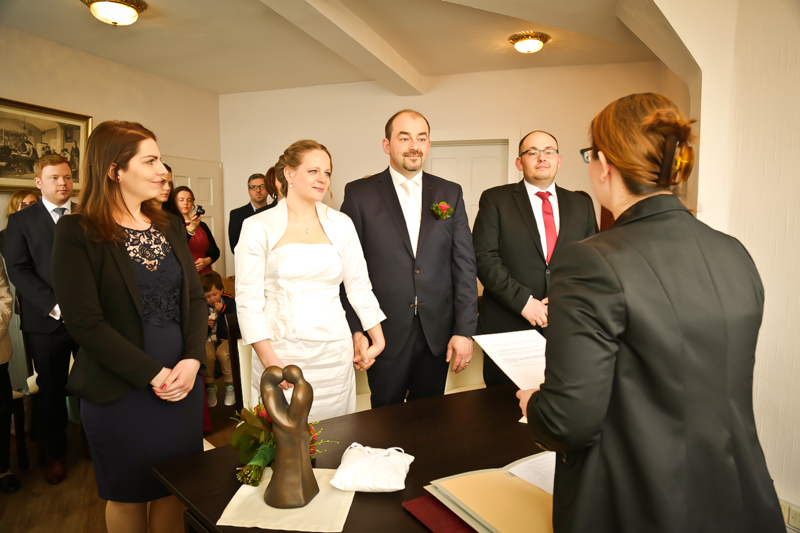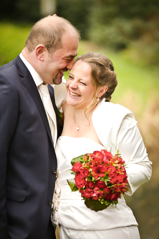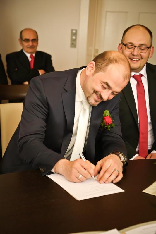 Während der Trauung waren beide sehr bewegt und so rollten die ersten Tränken über die Wangen. Ein deutliches Ja auf beiden Seiten sorgte für einen innigen Moment. Nach geleisteter Unterschrift, war das Glück besiegelt. Nach den Gratulationen durch die Familien folgten die Bilder fürs Familienalbum. Danach ging es weiter zum Sektempfang in ein nahegelegnes Café. Während die Gäste dort kurz verschnaufen konnten, ging es für uns zum Brautpaarshooting in einen nahegelegnen Park. Hier flapsten die beiden mächtig rum und es gab viele Momente, wo wir vor lauter Lachen kaum noch Fotos machen konnten. So entstanden eine ganze Menge sehr natürlicher und ausgelassener Brautpaarbilder. Schon nach kurzer Zeit beendeten wir die Session und fuhren zur Location, in der die Feier geplant war. Auch hier nutzten wir noch einmal die Gelegenheit ein paar intime Fotos der beiden zu schießen.