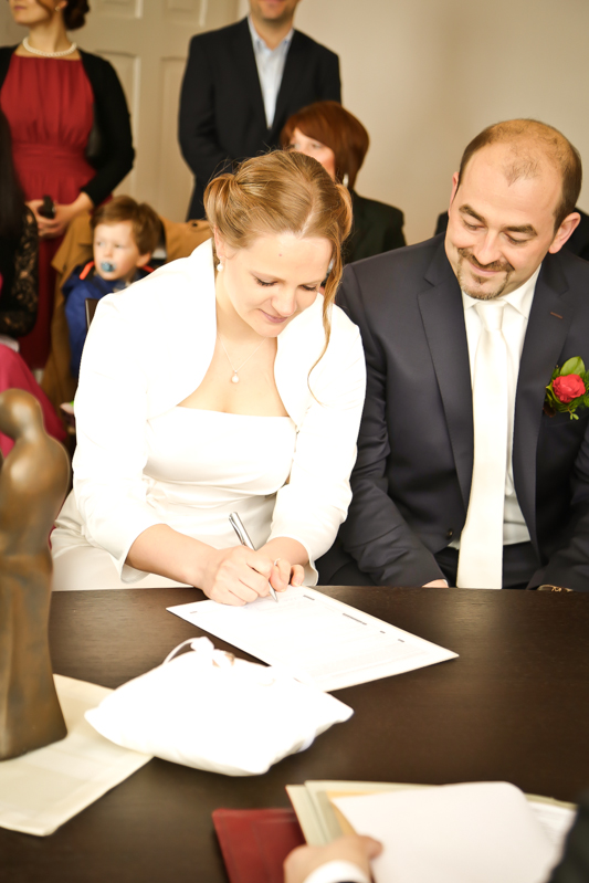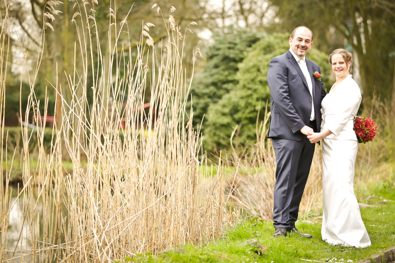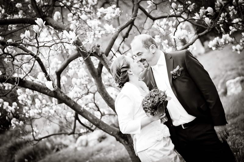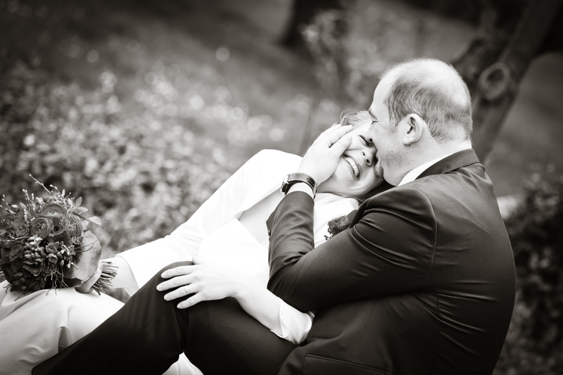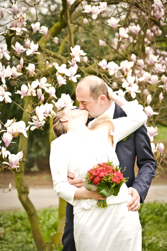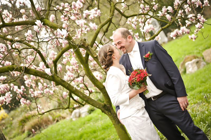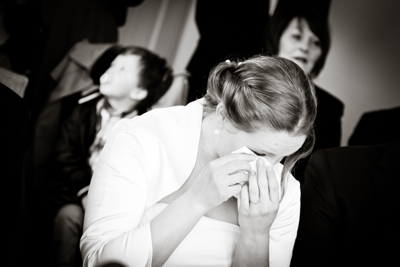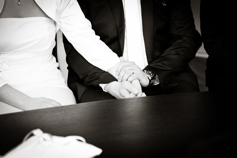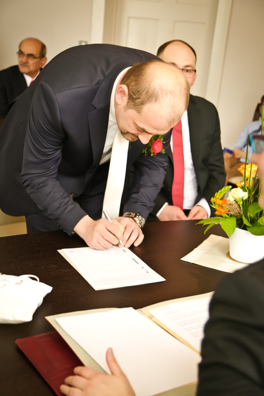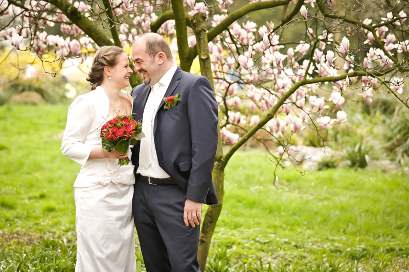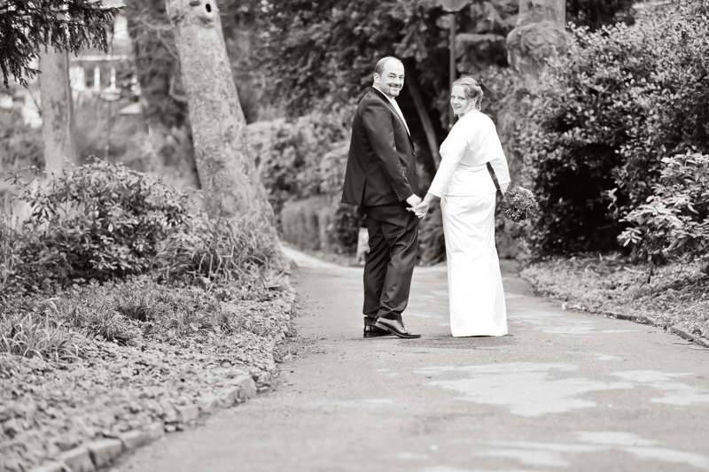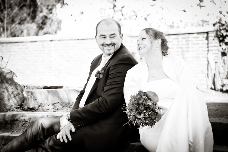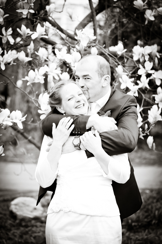 Während der Trauung waren beide sehr bewegt und so rollten die ersten Tränken über die Wangen. Ein deutliches Ja auf beiden Seiten sorgte für einen innigen Moment. Nach geleisteter Unterschrift, war das Glück besiegelt. Nach den Gratulationen durch die Familien folgten die Bilder fürs Familienalbum. Danach ging es weiter zum Sektempfang in ein nahegelegnes Café. Während die Gäste dort kurz verschnaufen konnten, ging es für uns zum Brautpaarshooting in einen nahegelegnen Park. Hier flapsten die beiden mächtig rum und es gab viele Momente, wo wir vor lauter Lachen kaum noch Fotos machen konnten. So entstanden eine ganze Menge sehr natürlicher und ausgelassener Brautpaarbilder. Schon nach kurzer Zeit beendeten wir die Session und fuhren zur Location, in der die Feier geplant war. Auch hier nutzten wir noch einmal die Gelegenheit ein paar intime Fotos der beiden zu schießen.