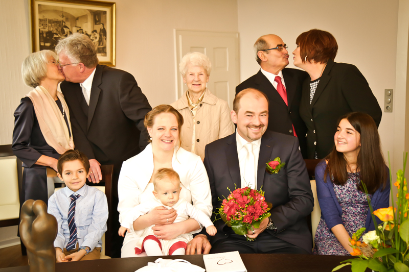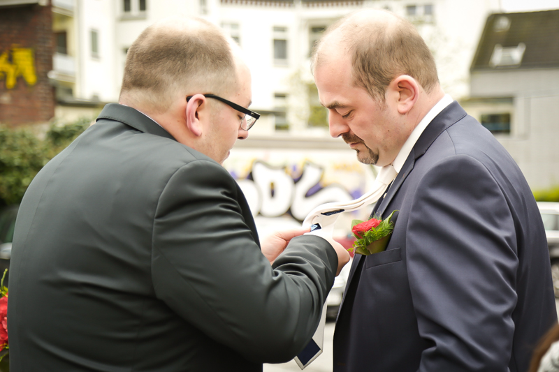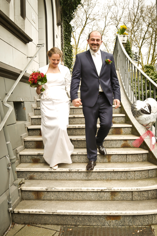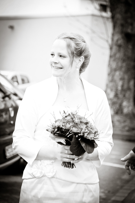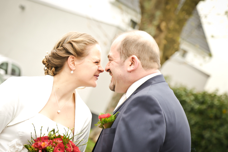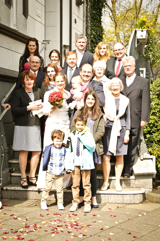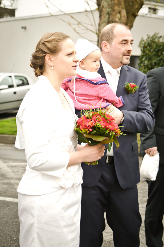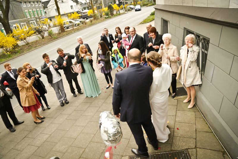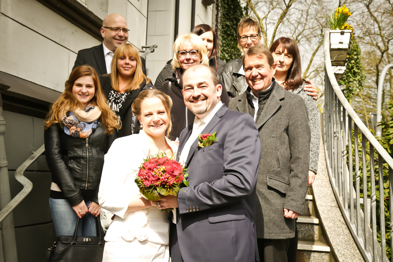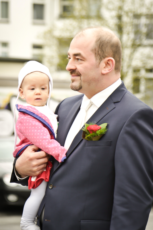 Es gibt Hochzeiten auf die freut man sich ein bisschen mehr. Genau so eine Hochzeit durfte ich im April als Fotografin begleiten. Britta & Claudio lernte ich durch ein ehemaliges Brautpaar von mir kennen. Der Bruder und die Schwägerin von Claudio gaben sich im letzten Jahr das Ja-Wort (Liebe Mandy, lieber Alessandro – an dieser Stelle alles Liebe zu eurem ersten Hochzeitstag!!!) und auch hier durfte ich Bilder zaubern. Schon damals fühlte ich mich innerhalb der Familien pudelwohl und wurde mit ganz viel Herz und Humor empfangen. So erging es mir auch diesmal. Bei zwar kaltem, aber dennoch sonnigen Wetter erwartete ich die beiden und ihre kleine zuckersüße Tochter vor dem Standesamt der Stadt Haan. Beiden war die Nervosität anzusehen, aber der Humor der beiden überstrahlte alles.