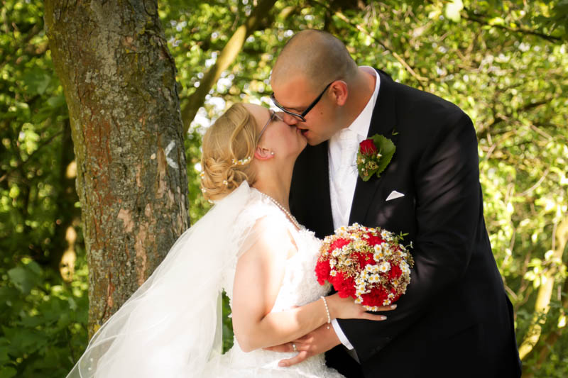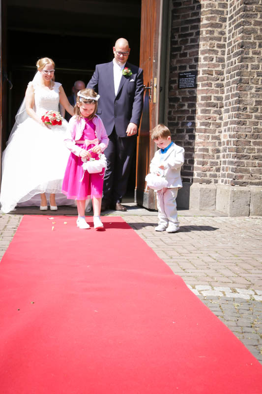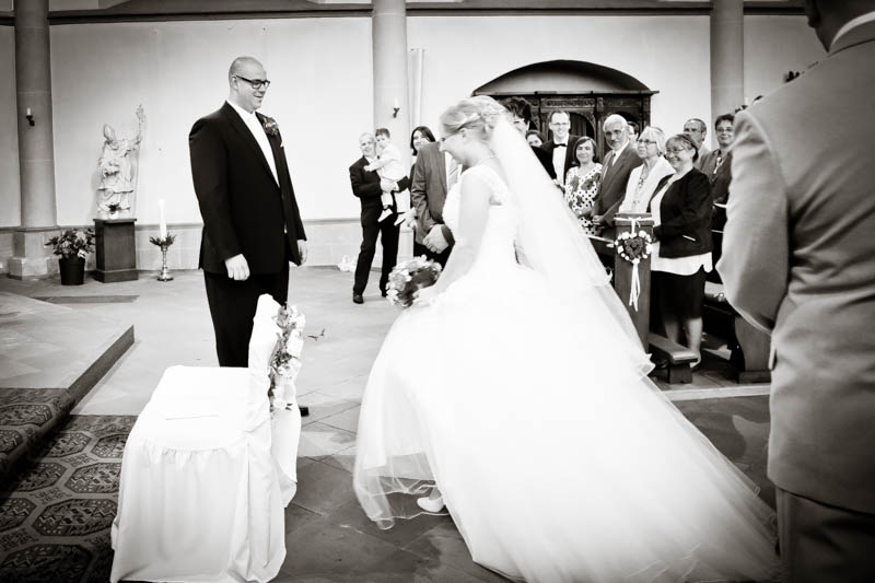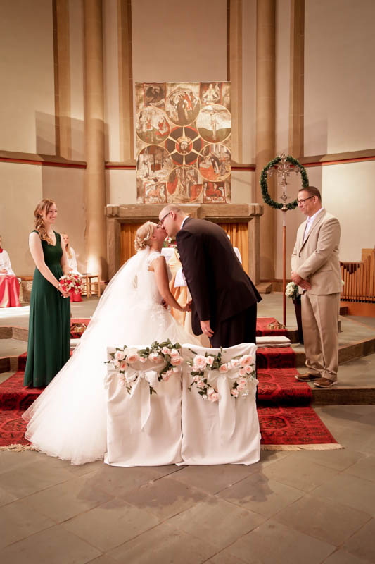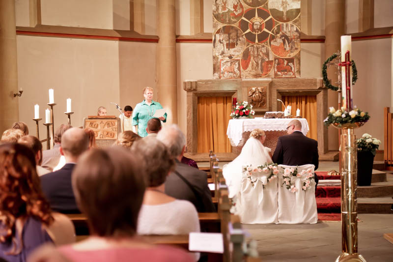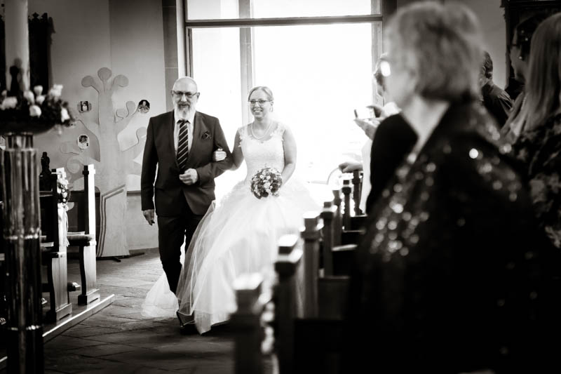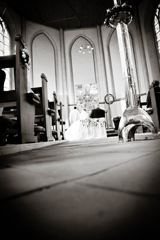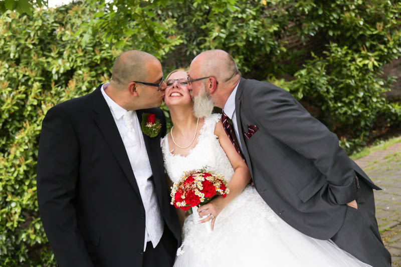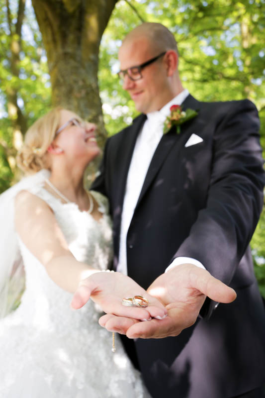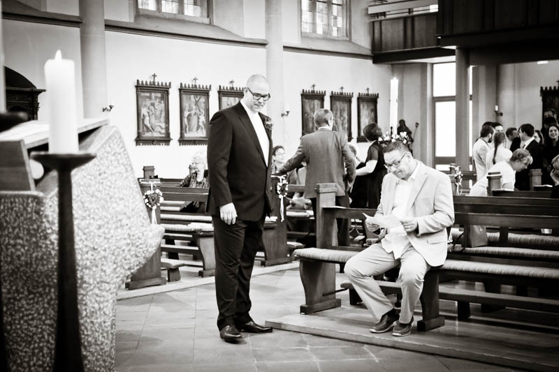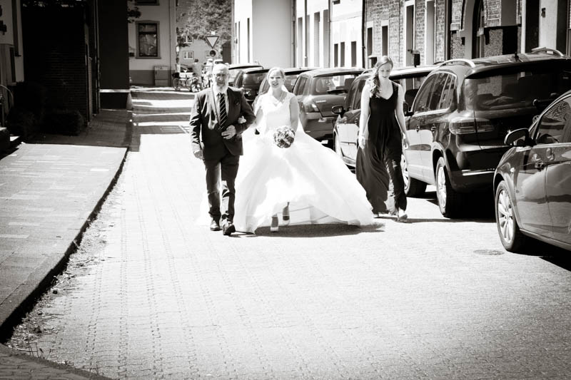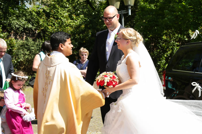 Beim Lesen dieses Gedichtes musste ich an eines meiner Brautpaare denken, welches ich euch heute vorstellen möchte: Frauke und Lars. Wir begegneten uns auf der Hochzeitsmesse in Duisburg Rheinhausen und nach einem persönlichen Kennenlernen in meinem kleinen Fotostudio war klar, dass ich die beiden an ihrem grossen Tag im Mai als Fotografin begleiten werde. Schon in unserem Kennenlerngespräch haben die beiden mich fasziniert. Wirkten sie erst einmal unterschiedlicher wie kaum möglich, entdecke ich recht schnell, wie gut die beiden sich ergänzen und das sie gemeinsam perfekt harmonieren. Sie entschieden sich für eine Halbtagsreportage ihrer Hochzeit und so starteten wir vor Beginn der Trauung. Treffpunkt war die St. Nikolauskirche in Rheinberg Orsoy. Das Wetter meinte es besonders gut mit uns und so konnten wir – bei wunderbar warmen Temperaturen – die strahlende Sonne geniessen. Die eintreffenden Gäste fanden sich schnell in der schmucken Kirche ein und der „etwas“ nervöse Bräutigam wartete tapfer auf seine Braut. Diese kam pünktlich zu Traubeginn an Papas Arm zur Kirche gelaufen und strahlte mit der Sonne um die Wette. Der zuständige Pastor hielt eine wunderbare und sehr humorvolle Predigt, die alle Anwesenden immer wieder zu Tränen rührte. Die Stimmung war einfach wunderbar herzlich und so verging die Zeit mit den vielen kleinen Anekdoten wie im Flug.